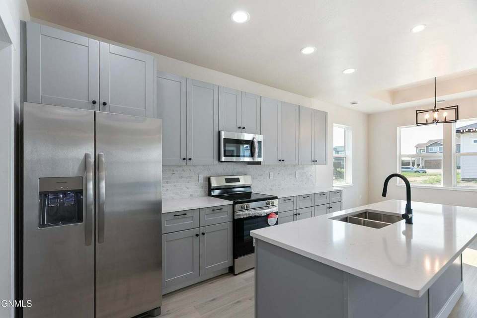 - Sleek quartz countertops, custom tile backsplash, and large windows