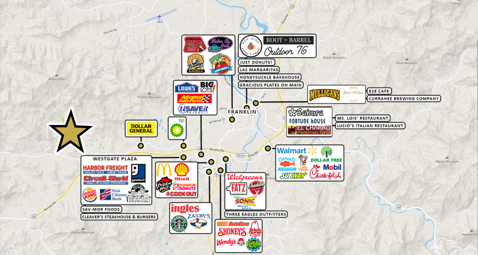 The property is located in Franklin, North Carolina which is approximately 19.5 miles from Highlands, North Carolina. Franklin is a unique town nestled in the heart of the Blue Ridge Mountains in the foothills of the Great Smokies. Franklin's population nearly doubles during the spring, summer and fall seasons due to our temperate climate and beautiful scenery. Our geographical position enables us to enjoy cool summer nights and mild winters; the Town sponsors and hosts many festivals and events each year. With a healthy tourism industry and lots of local people taking an active role in the community, there are always exciting activities and places to go.