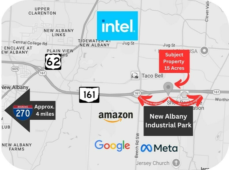 Excellent development site next to New Albany's industrial park and the new Intel Chip Fabrication Campus. Site is ideal for industrial, retail and/or hospitality use. Site currently is zoned for mini-storage and agricultural, but has jurisdiction support for rezoning and potential annexation. Best offers will be considered.