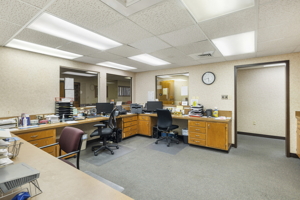 Floor plan includes 6 exam rooms, 3 doctor’s offices, waiting room, reception area, 5 bathrooms, lounge, and extra rooms & storage