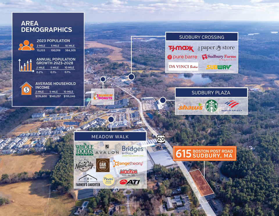 615 Boston Post Road is located directly on Route 20 in Sudbury. The property is approximately 6.8 miles to/from the Massachusetts Turnpike (I-90) and 8.2 miles to/from I-495. Route 20 offers an abundant amount of retailers, restaurants, and amenities to offer, causing the property to be in a high traffic and convenient area.