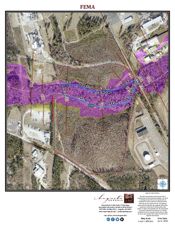 Approximately 18 acres are floodzone/wetlands which separate the two parcels. According to federal maps the wetlands are primarily contained in the same flood zone area. Site has a rail line with a spur that runs across entire property just north of creek. The Marvin Griffin Rd side is very flat. The Dixon Airline Rd tract slopes down from the front to the creek roughly 70-80 foot. Half of the 62 acres is more gradual meaning site could be balanced more than likely without brining in extra dirt. Site has always been undeveloped.