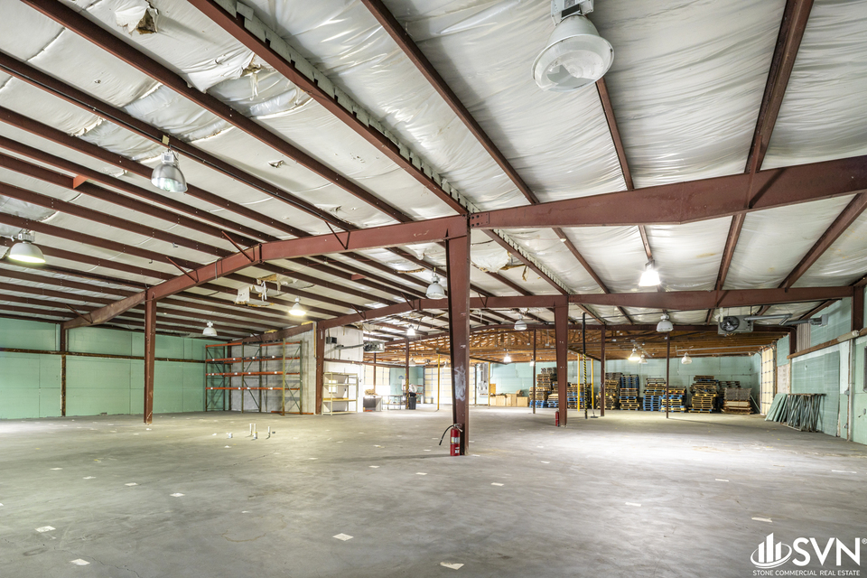 The second building totals +/- 12,584 sq. ft. and is primarily open warehouse space. It includes a small office area, four grade-level drive-in doors, 15-foot clear height, and suspended gas units — ideal for a variety of uses.