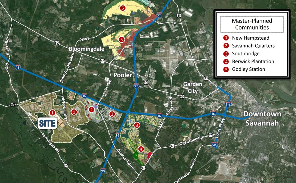 The property is located at the entrance to New Hampstead at GA Highway 204 and Highgate Boulevard. New Hampstead is a 4,300-acre master-planned development. The development includes 10,000 residential units projected at full build-out, two (2) public schools, an expansive Nature Preserve, a planned City Park, as well as various retail and commercial developments. New Hampstead features multiple entrances, with this one only seven (7) miles west of I-95 (Exit 94), a second six (6) miles northwest of Highway 17 (Ogeechee Road) at Little Neck Road, and a third at the interchange of Little Neck Road and I-16 (Exit 152). Directly west on GA Highway 204, it is less than 10 miles from the community of Ellabell, where the Hyundai Motors Electric Vehicle plant is nearing completion. The immediate area has become extremely attractive to local, regional and national businesses and is poised for high growth in the immediate future.