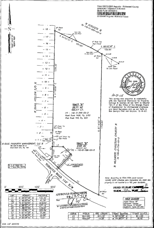 In addition to direct access from Tobacco Road, the property may be accessed through the neighboring Woodlake and Quail Hollow subdivisions. The City of Augusta owns an adjacent 37-acre tract to the rear and has expressed interest in collaborating on future development options.