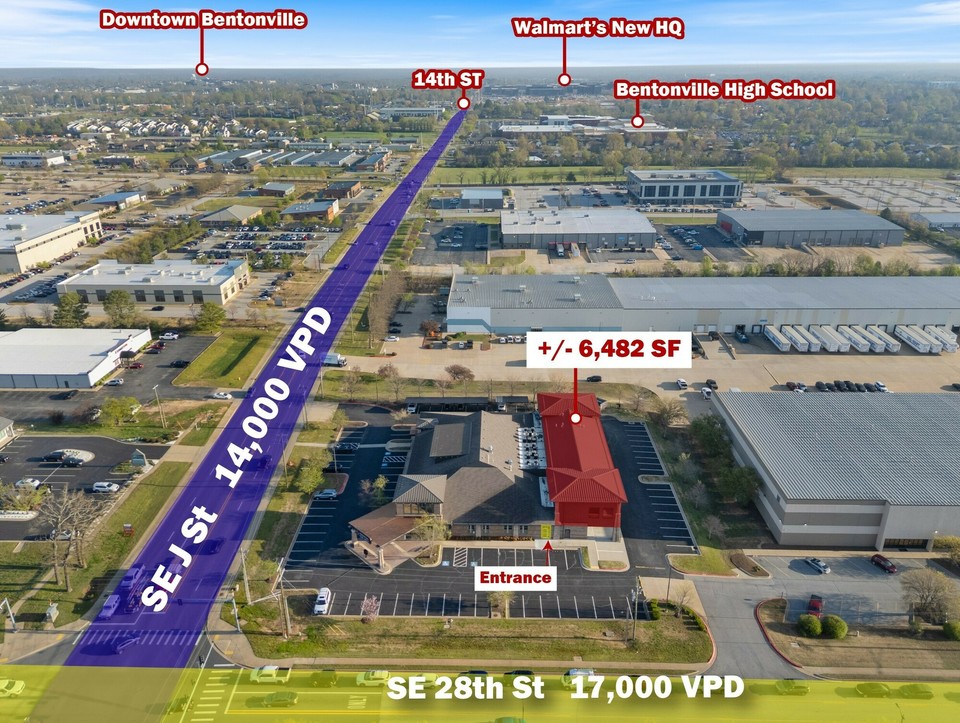 +/- 6,482 SF of prime office space is now available for lease in a highly sought-after location. Situated on the second floor, this spacious suite includes nine private offices with elegant glass pane doors, two large open areas ideal for bullpens or collaborative workspaces, a private restroom, and expansive windows that provide abundant natural light. The property offers both elevator and stair access for convenience. Strategically located at the corner of 28th St (17,000 VPD) and J St (14,000 VPD), this office space is less than five minutes from the new Walmart World HQ and I-49, and approx. eight minutes from Downtown Bentonville. Offered under a NNN lease structure with a minimum three-year term, tenants will be responsible for any separately metered utilities.