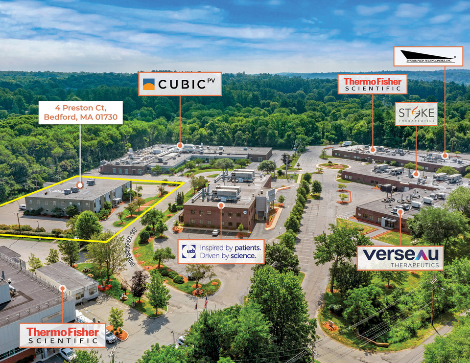 Preston Court is home to Boston's most advanced lab, biotech, and service companies seeking Ind-B zoning and access to a skilled talent pool. Neighbors include Thermo Fisher Scientific, Stoke, Diversified Technologies, Cubic PV, and UCB. There are 16,053 white-collar employees within a 3-mile radius of the property, providing ample demand for office space in this 128 location and proximity to some of the Boston area's most affluent suburbs. The property is surrounded by conservation land near the Minuteman Bike Path and Hanscom Air Force Base and enjoys easy access to Routes 3, 128, and 225.