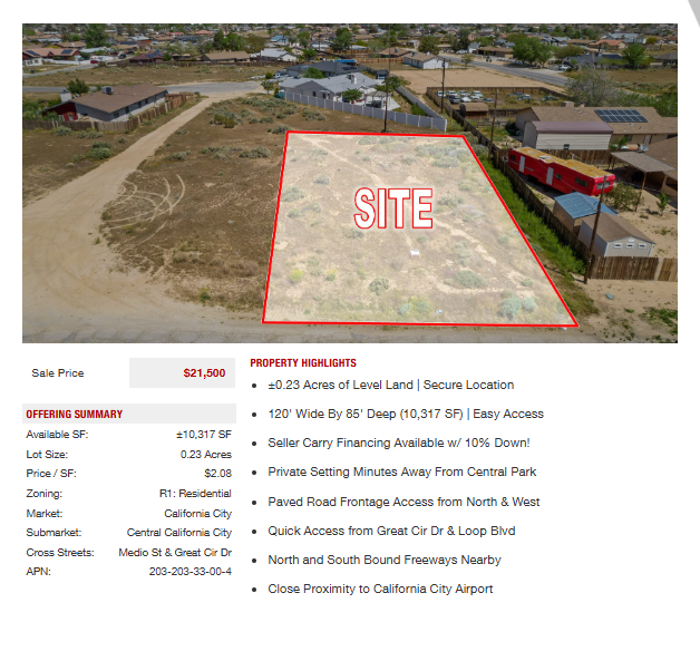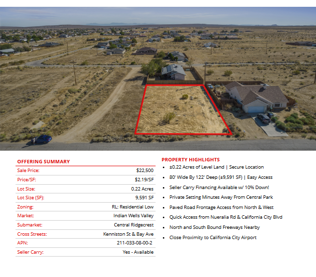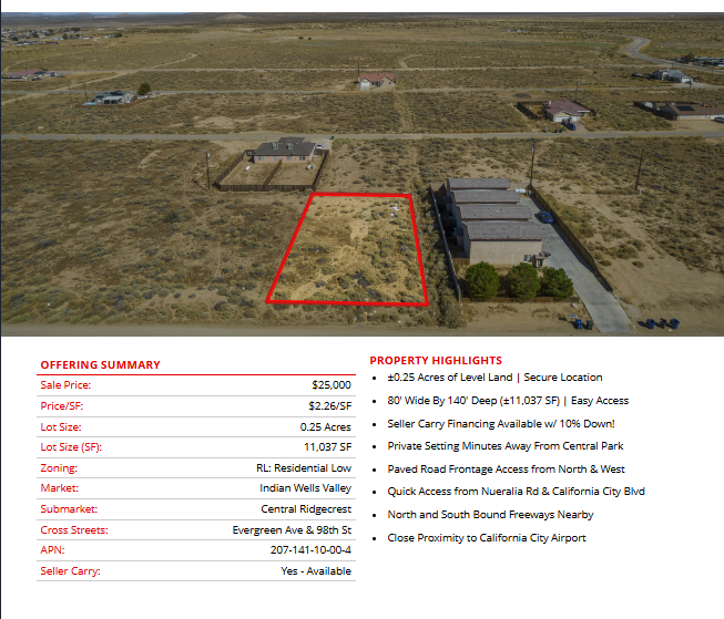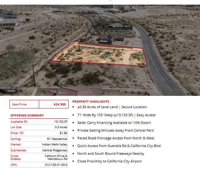 Prime semi-custom SFR development land totaling ±3.8 Acres (±165,715 SF) located in California City (11 lots), Edwards (1 lot), and Ridgecrest (1 lot). The parcels are centrally located in each city, leading to easy access into all major retail hubs and highways to Los Angeles, Fresno, Bakersfield, and the coast. Existing paved roadways leading to the properties from neighboring developments are in place and the land is a blank and clean canvas for flexible concepts. Land parcels are near Interstate 5, highways 299, 89, and 99 providing easy access to Tulare, Kings, Fresno, Los Angeles county & many others! SFR development is consistent with the land use (adjacent parcel & across the street), is within the holding capacity, conforms to all policies, avoids traffic congestion, and is ready for flexible concepts.