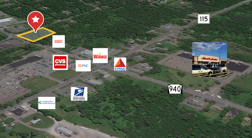 3.85 ac Commercial Development Site on State Route 940. The corner location at Old Farm Rd potentially allows for easier access and HOP approval. The site had plans for a 23,000+ SF proposed retail/office building. Some engineering has been completed. It is located just off the busy intersection of Route 940/115 in Blakeslee. It is adjacent to Dunkin Donuts and Dollar General. Central sewer is available.