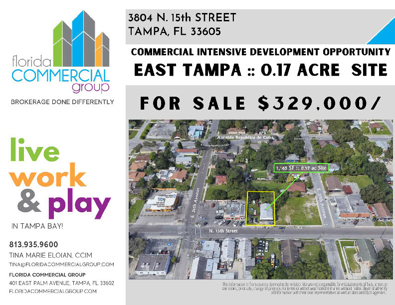 Some accessible destinations around the city with commute times include Ybor City: 1 mile/ 3 minutes, Downtown Tampa: 2 miles/ 7 minutes, Tampa International Airport: 14 miles/ 20 minutes and I-275: 1 mile/ 4 minutes. This is a buzzing residential/ commercial district that is frequented by local residents and exploding with new commercial and residential occupants making this site a great investment opportunity, relocation site or expansion location for your growing business or portfolio. Call for a property brochure.
