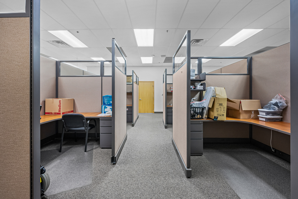 - Currently built out as office space which features a reception area, four private offices, cubicle area, conference room, conference hall kitchen, two restrooms, and storage