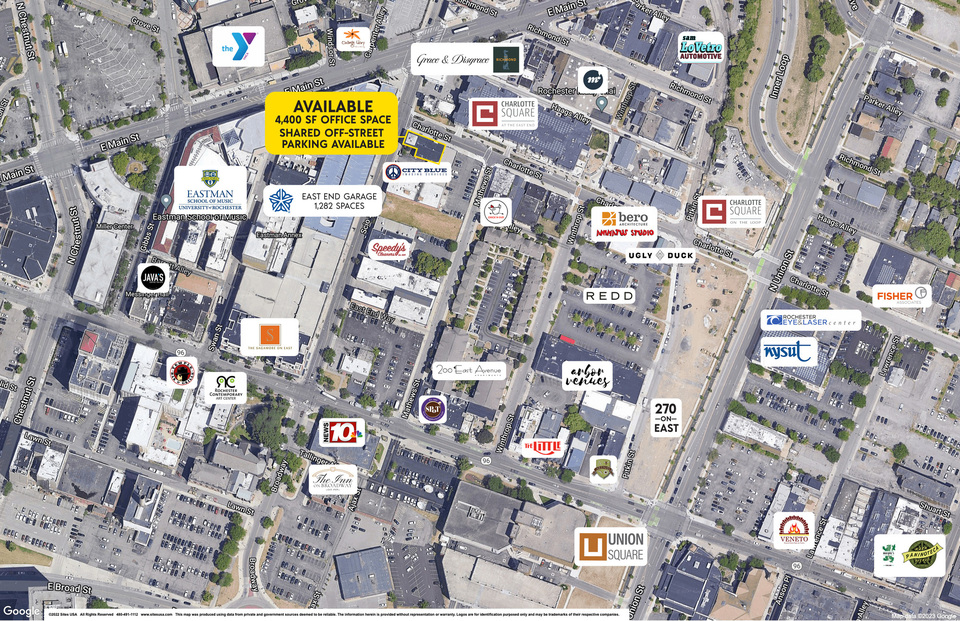 The available second floor space is located in Rochester's East End neighborhood, home to a variety of bars, restaurants, dense residential units, and several small businesses as well as cultural institution such as the Eastman School of Music, Eastman Theatre, and Little Theatre. The space is located on the corner of Charlotte Street & Scio Street. Nearby businesses include City Blue, Chick'n Out, The Richmond, SPoT Coffee, Speedy's Cleaners, Redd, Ugly Duck Coffee, and News 10 NBC.