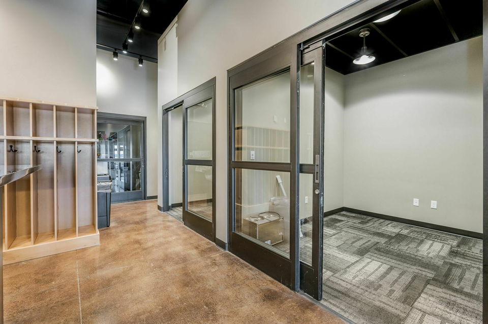 This modern finished retail space includes a coffee bar area, a reception area, seven offices with glass-front finishes, a conference room, two bathrooms, a kitchenette and a co-working table.
