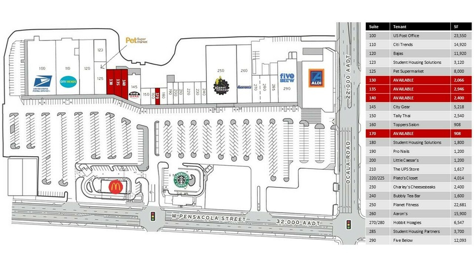 This center is anchored by Aldi, Planet Fitness, Five Below, and Pet Supermarket. Just minutes from Florida State University, Tallahassee Community College, and The FSU Stadium, this location offers exceptional visibility and access to a dense student, residential, and commuter population.