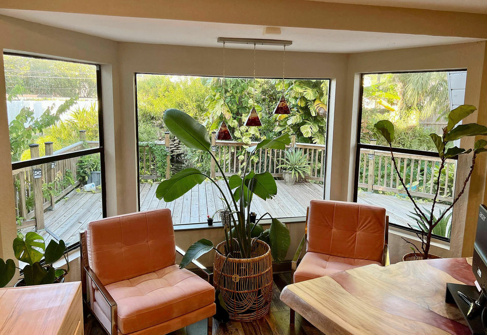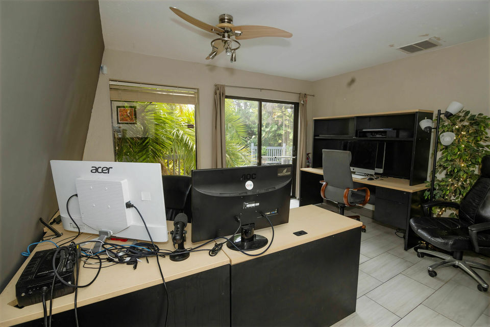 The second floor opens up to a living room gathering area to the right. On the left, there is a dining area and a full kitchen. Proceeding down the main hallway is a full bathroom on your left and a private office to the right. At the end of the hallway is a complete sound and video room for podcasts and recording. This room has been redesigned for sound production. There is also another full bath connected to the studio.