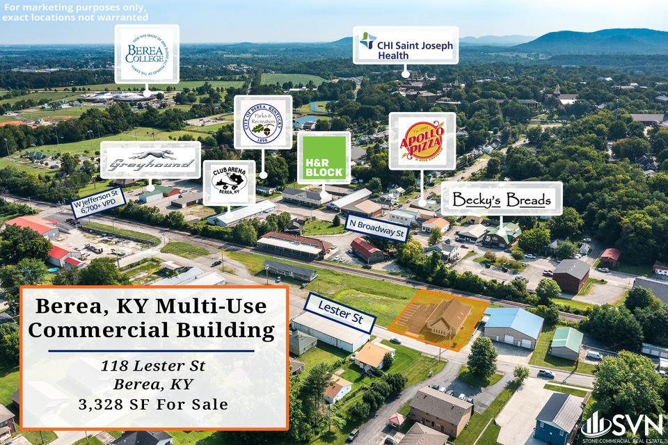 SVN Stone Commercial Real Estate is pleased to bring to market this Commercial multi-use property in the heart of Berea, KY. Located at 118 Lester Street, this property offers versatility for the Owner Occupant, or Investor. Ground floor square footage of 3,328 square feet, it caters to a variety of business needs. The property is zoned B-2, a major business zone, and wide range of uses. The current ownership added new electric, windows, drywall, lighting, exterior paint and the loft space could be ideal for a live in owner, or apartment for income.