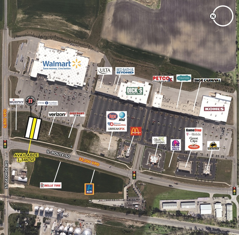 SVN Chicago Commercial is pleased to present Bradley Commons Shopping Center, located at IL-50 and St. George Road in Bourbonnais, IL. As the region's premier power center, it is comprised of over 50,000 SF of anchor and small shop retailers including Wal-Mart, Kohl's, Dicks Sporting Goods, Bed Bath & Beyond, and Petco. The diverse national tenant mix, ideal location, and high visibility draw customers from Bradley, Bourbonnais, Kankakee, Peotone, and Manteno. With ample parking and excellent signage opportunities, this property is poised to elevate your business to new heights. 1,346 SF of retail is available in the new multi-tenant retail building facing IL-50 and adjacent to Jimmy John's and Sleep Number.