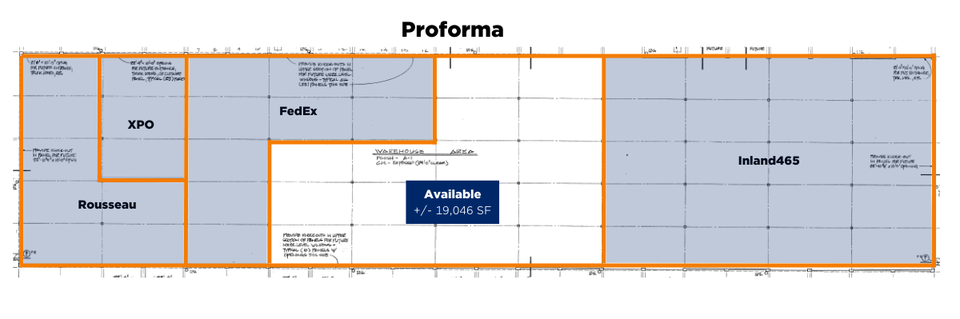 The warehouse is configured for distribution use with 34 dock-high loading doors along the rear, two large overhead drive-in doors at each end, and wet sprinkler coverage. Interior improvements include two non-load bearing demising walls with openings for drive-through circulation. The warehouse areas are unheated and uninsulated.