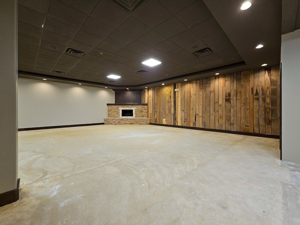 Lower level space for lease. Ideal fitness/ office / professional uses. Open layout. Features a fireplace and two private ADA restrooms. Limited private onsite employee parking.
