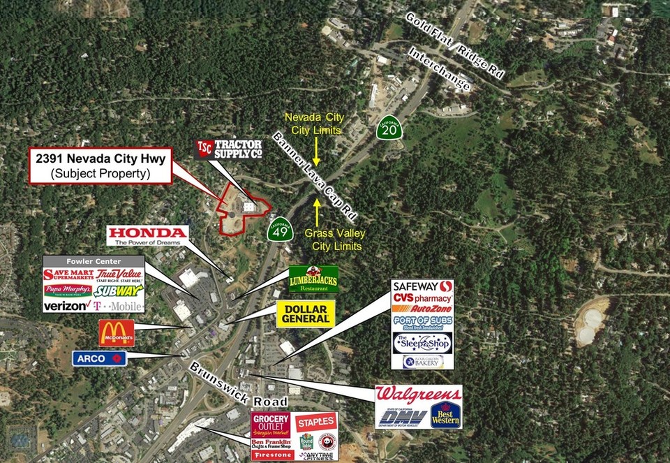 Grass Valley is nestled in the Sierra Nevada foothills only one hour from both Lake Tahoe and Sacramento. The area is located below the snow line and above the fog for a perfect 4-season climate. Nevada Countys economy has effectively transformed from mining & forestry to vibrant high-tech and tourist based industries. This area continues to attract residents and businesses from the nearby Sacramento and San Francisco Bay areas. The Brunswick/Glenbrook Basin is the most active commercial hub in the City of Grass Valley, lying on both sides of Highway 49 at the Brunswick Road exit adjacent to Nevada City. The area contains 3 anchored centers with tenants including Safeway, SaveMart, CVS, RiteAid, Walgreens, Staples, and various national banks & fast food eateries.
