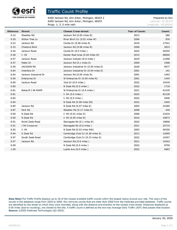 With 437 feet of frontage on Jackson Road between Zeeb Road and Baker Road, the property provides excellent exposure in one of the area’s most active commercial districts. Traffic counts exceed 15,000 vehicles per day, and the location offers quick access to I‑94, M‑14, and US‑23, as well as convenient connectivity to downtown Ann Arbor.