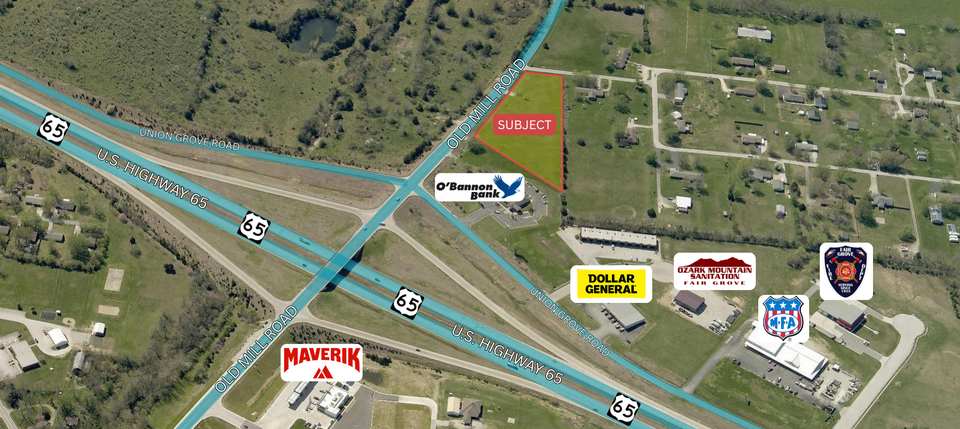 The property is conveniently located off Old Mill Road, near Highway 65, offering excellent access and visibility. Nearby businesses and community landmarks include O’Bannon Bank, Dollar General, Maverik, Price Cutter, the Fair Grove Fire Department, Fair Grove R-X School, and the historic Wommack Mill, among others.