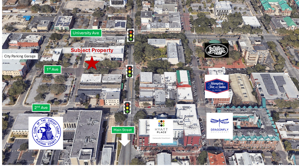 Downtown Gainesville, also known as the heart of the city, refers to the area surrounding the intersection of Main Street and University Avenue. This area is an eclectic mix of quaint shops, restaurants, bars, and clubs and is home to the Hippodrome State Theatre and Bo Diddley Plaza, a performance and event venue. With a mix of historic buildings, government offices, trendy nightlife and upscale restaurants, Downtown Gainesville caters to a broad range of consumers and offers newly integrated city zoning changes to increase development opportunities within the heart of Gainesville.