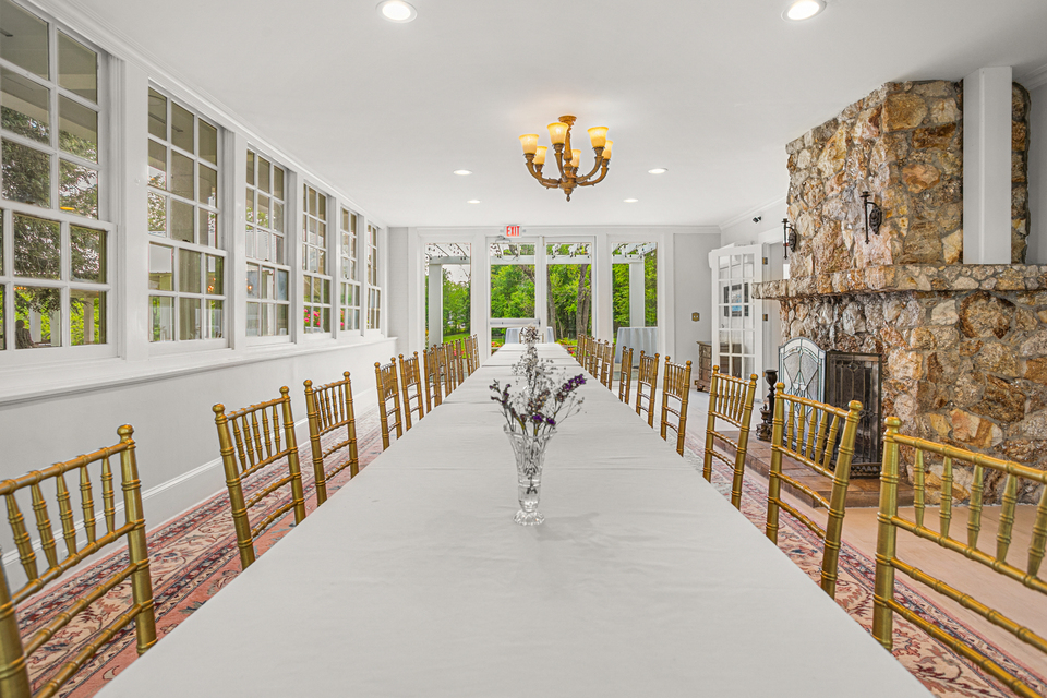 The property is perfect for both indoor events and outdoor gatherings. Its 900 sq ft patio and 2400 sq ft covered pavilion with enormous chandeliers, offer beautiful views of the house, the pond and the lawns. Gracious interior spaces can comfortably accommodate approximately 100 guests.