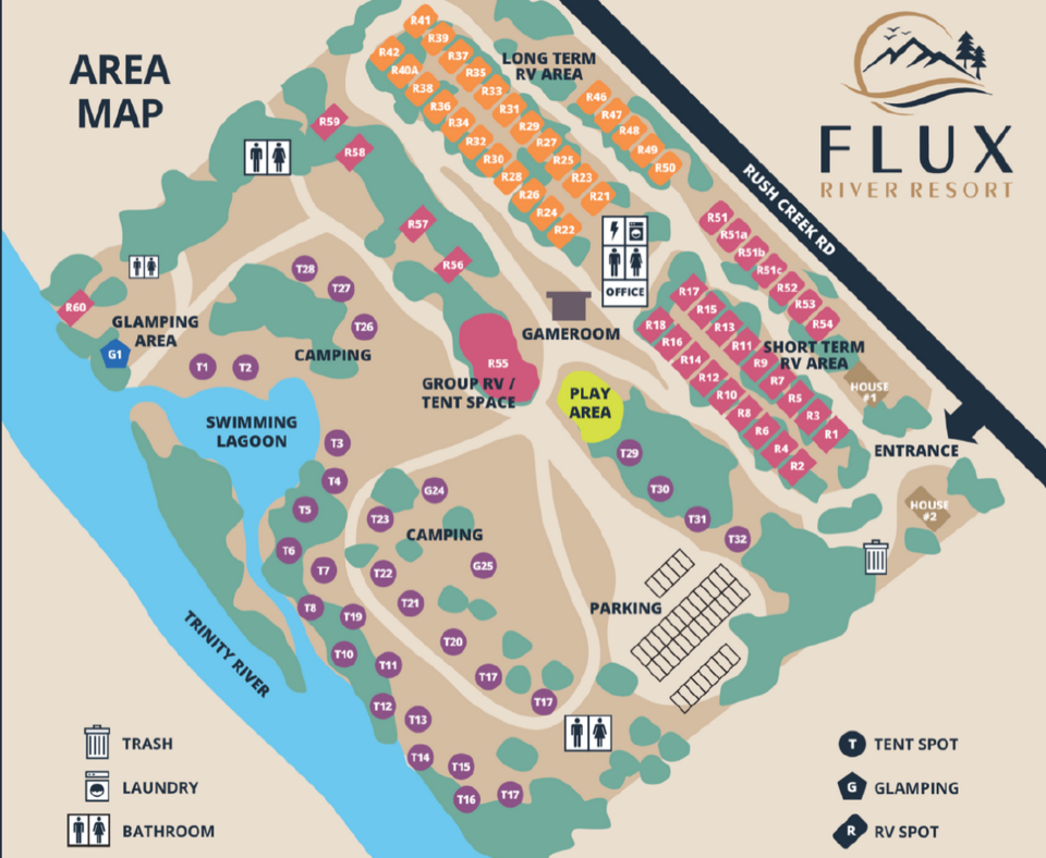 Flux River Resort a +/-12 Acre retreat along the Trinity River located at 7420 Rush Creek Rd in Lewiston, CA, is a recently renovated community with excellent revenue upside. Originally built in 1970, this retreat property includes per HCD (50) MH spaces, (2) Mobile Homes (POH), (40) camping sites, upgraded laundry room, bathrooms and showers, and a recreational club house. The community offers affordable living with monthly site rents ranging from $550 plus utilities along with camp sites for $45 average daily rate (ADR).