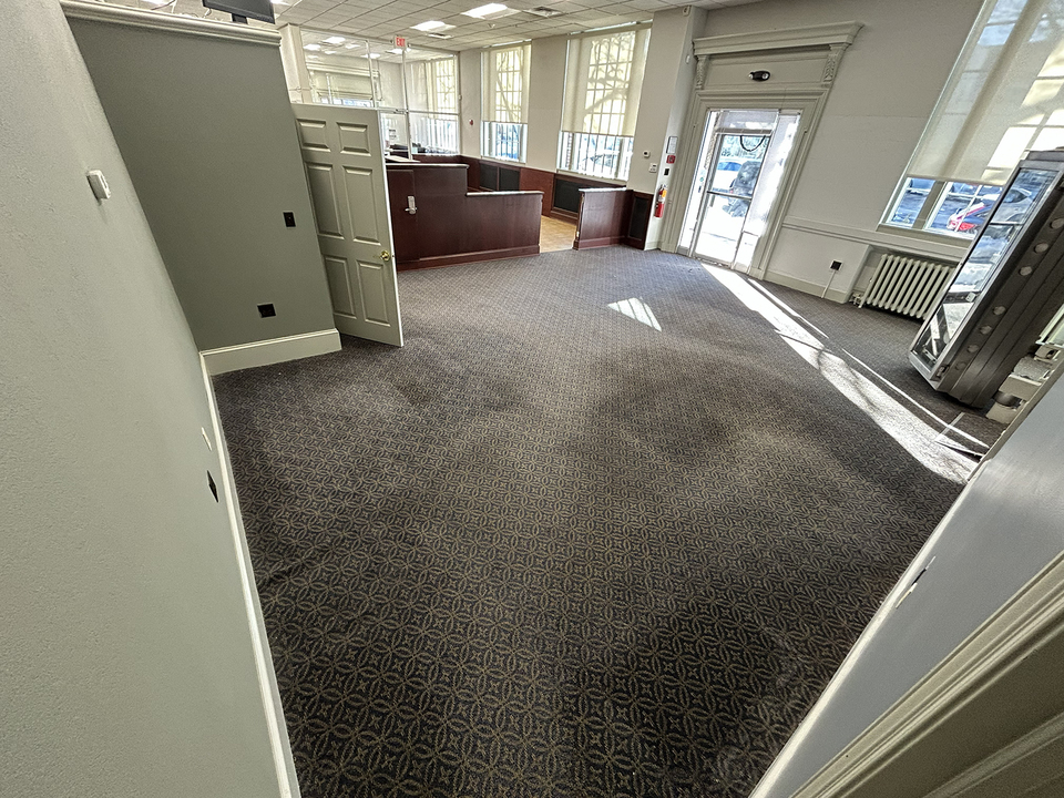 - Ground Floor (±3,200 SF): Open customer lobby with teller line in place, private offices, kitchenette/break room, restrooms, vault access, secure operational areas, and large windows with natural light