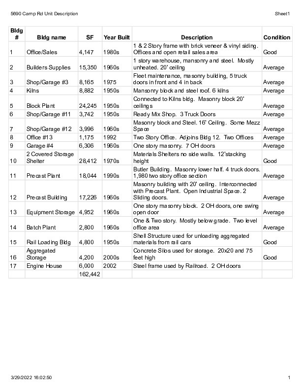 Consists of a 1 and 2 story industrial complex that contains 129,230 +/- SF of buildings, situated on several contiguous lots containing a total land area of 53.99 +/- acres. 7.59 +/- acres of the site is not contagious to the main parcel and is land locked as there is no direct street access to this parcel. 268 +/- feet of frontage along Old Camp Road. There is additional frontage and access from Englewood Avenue and Elmview Avenue. There is good access to the property. All utilities including gas, electric, telephone and water are accessible to this site. Electricity for the building is obtained through low voltage power lines. Adequate input of 800 amp volt electric service. Improvements include asphalt paved parking areas, curbing, signage. landscaping, yard lighting and drainage. There is a master meter for the property. The buildings have a backup generator. Sprinklers are in some areas. The site consists of two concrete batch plants, a structural Precast plant, concrete block plant, a builders supply warehouse, truck repair shop, fabricating shop, rail cement/aggregate unloading facilities aggregate storage building, engine storage building, main office building and concrete products storage. There is adequate drive and loading areas to each of the buildings. Zoning is Heavy Industrial, M-2 and M-3 the current use is Manufacturing