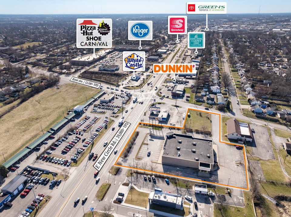 Positioned along New Circle Road (36,658 VPD), this property offers high visibility and accessibility in a well-established retail corridor. Located next to a newly constructed Dutch Bros Coffee, Chick-Fil-A, Panda Express, Bank of America, Kroger, and more. The site benefits from strong retail synergy along New Circle Road. The property features a drive-thru, ample parking, and pylon signage, making it well-suited for retail, medical, office, or other commercial uses under its B-3 zoning.