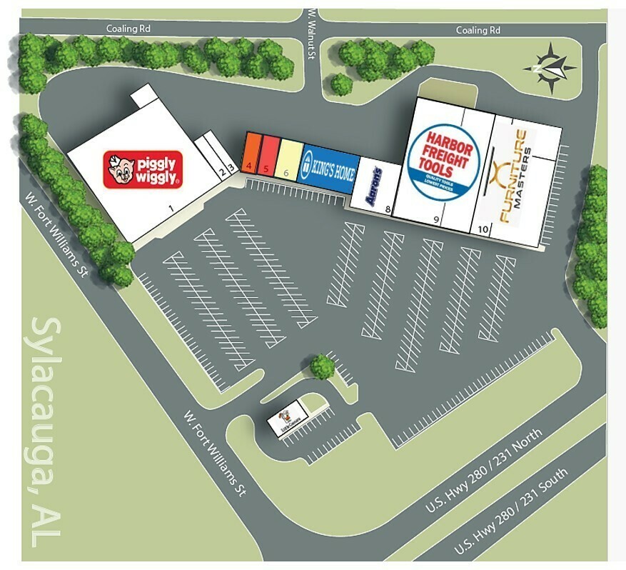 Fort Williams Square is a 106,607 SF shopping center in Sylacauga, Alabama, located along the busy Highway 231 corridor offering great access and visibility. Surrounded by Walmart, Home Depot, TJ Maxx, Hobby Lobby, Publix, 5 Below and anchored by national/regional tenants such as Harbor Freight, Piggly Wiggly, Aaron's. 1,200 SF - 2400 SF spaces currently available.