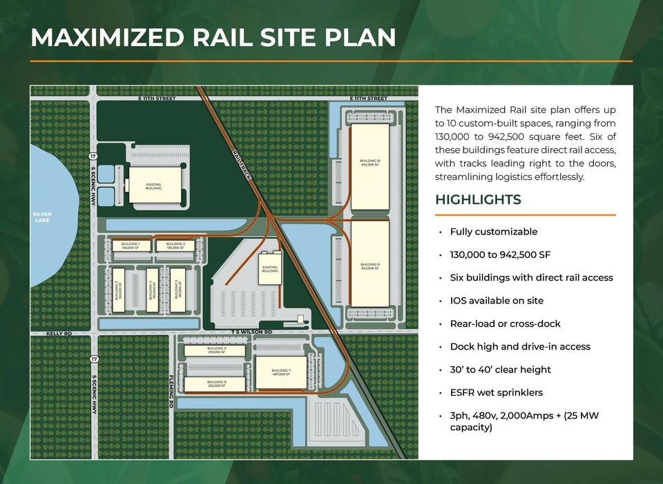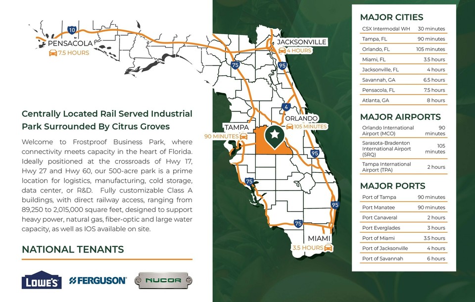 Welcome to Frostproof Business Park, where connectivity meets capacity in the heart of Florida. Ideally positioned at the crossroads of Hwy 17, Hwy 27 and Hwy 60, our 500-acre park is a prime location for logistics, manufacturing, cold storage, data center, or R&D. Fully customizable Class A buildings, with direct railway access, ranging from 89,250 to 2,015,000 square feet, designed to support heavy power, natural gas, fiber-optic and large water capacity, as well as IOS available on site.