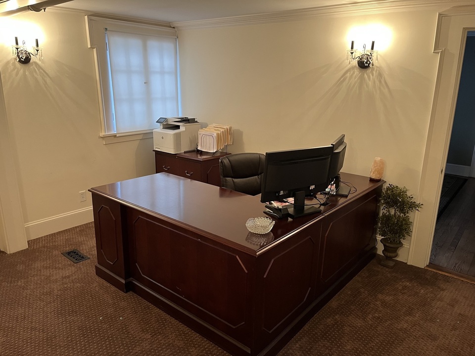 Fully furnished, executive office space on 2nd floor of converted historic residence. Great location for law firm, financial advisor, or other professional uses. Six room suite available. Potential to divide. Mix of hardwood and carpeted floors. Lots of windows. Shared entrance and restroom. Owner occupies two additional rooms on 2nd floor. Video virtual tour available.