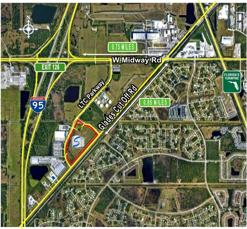 Prime location within Midway Business Park with frontage on Glades-Cut off Road, LTC Parkway and Delcris Road. Only 1.5 miles to I-95.