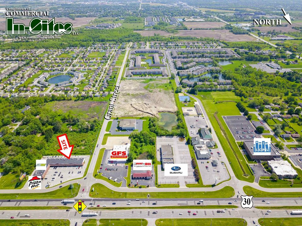 Excellent location with frontage on U.S. 30 at a high traffic stoplight corner access. Southeast corner of U.S. 30 and Grant Street, stoplight intersection with frontage road. Two miles west of I-65 and 1/2 mile east of Taft Street (SR 55). Adjoins Evergreen Luxury Apartments (700 units). Grant Street connects to Merrillville road through several residential subdivisions. Near Gordon Foods, Albanese Candy, Brothers Restaurant., Lake County Library and Infinity of Merrillville Dealership. 2024 INDOT traffic count 3,578 cars/day on Grant Street and 43,801 cars/day on U.S. Highway/81st Avenue.