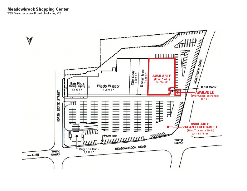 Large-box and outparcel opportunities available at a grocery anchored shopping center in North Jackson. Meadowbrook Shopping Center, anchored by Piggly Wiggly, and featuring a tenant roster that included Regions Bank, Dollar Tree, City Gear, and more. Located at the intersection of North State Street and Meadowbrook Road, this center lies within the Fondren District of Jackson and is in close proximity to multiple hospitals, office building, retailers and restaurants. Strong urban density surround the property and a newly announced 215-unit loft development on the adjacent corner provide a strong customer base.