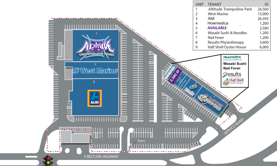- Co-tenants include Aldi, Altitude Trampoline Park, Half Shell Oyster House, Nail Fever, Wasabi Sushi & Noodles, and more