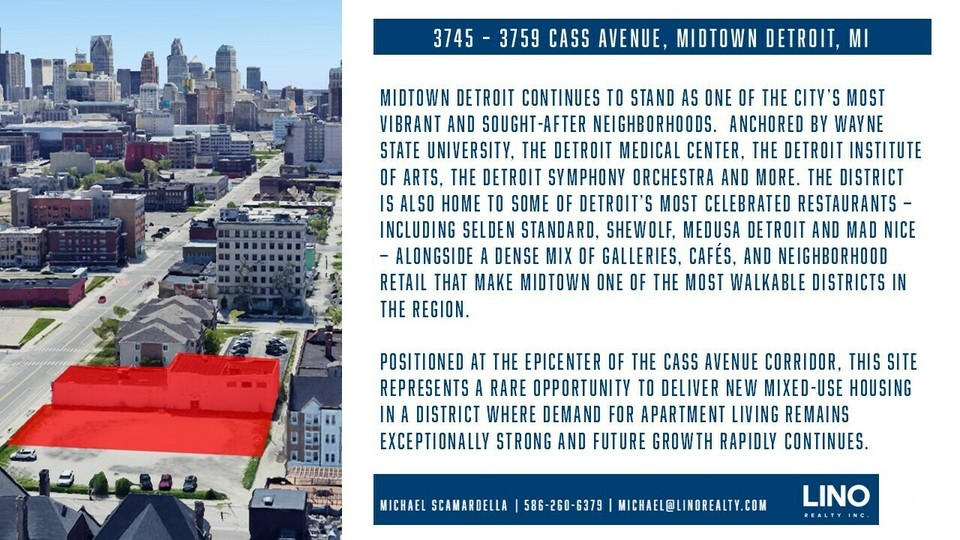 Surrounded by major anchors including Wayne State University, the Detroit Medical Center, the Detroit Institute of Arts, and the Detroit Symphony Orchestra, the site also benefits from proximity to popular destinations such as Selden Standard, SheWolf, Mad Nice, Whole Foods Market, the Majestic Theatre, and Little Caesars Arena—making this a premier location within one of Detroit’s most dynamic neighborhoods.