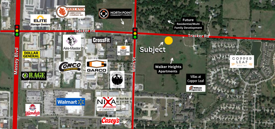 Located in Nixa, Mo at the intersection of Tracker Rd & Main St. Neighboring businesses include Great Southern Bank, Southernwood Apartments, Garage Experts, CrossFit, North Point Church, and many other local and national companies.