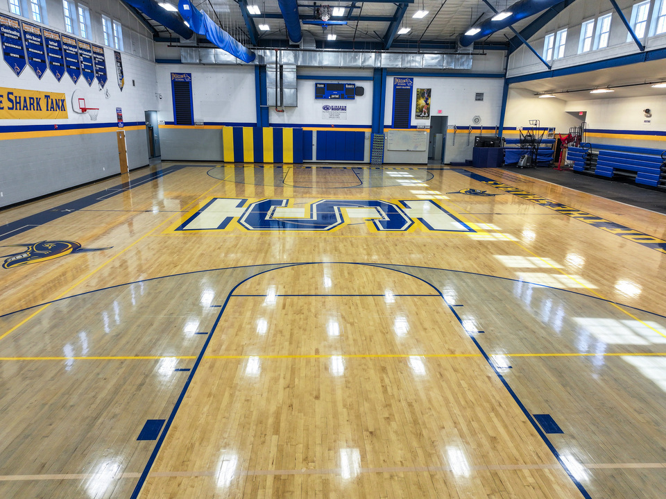 - Hardwood court floor suitable for basketball, volleyball, pickleball and more