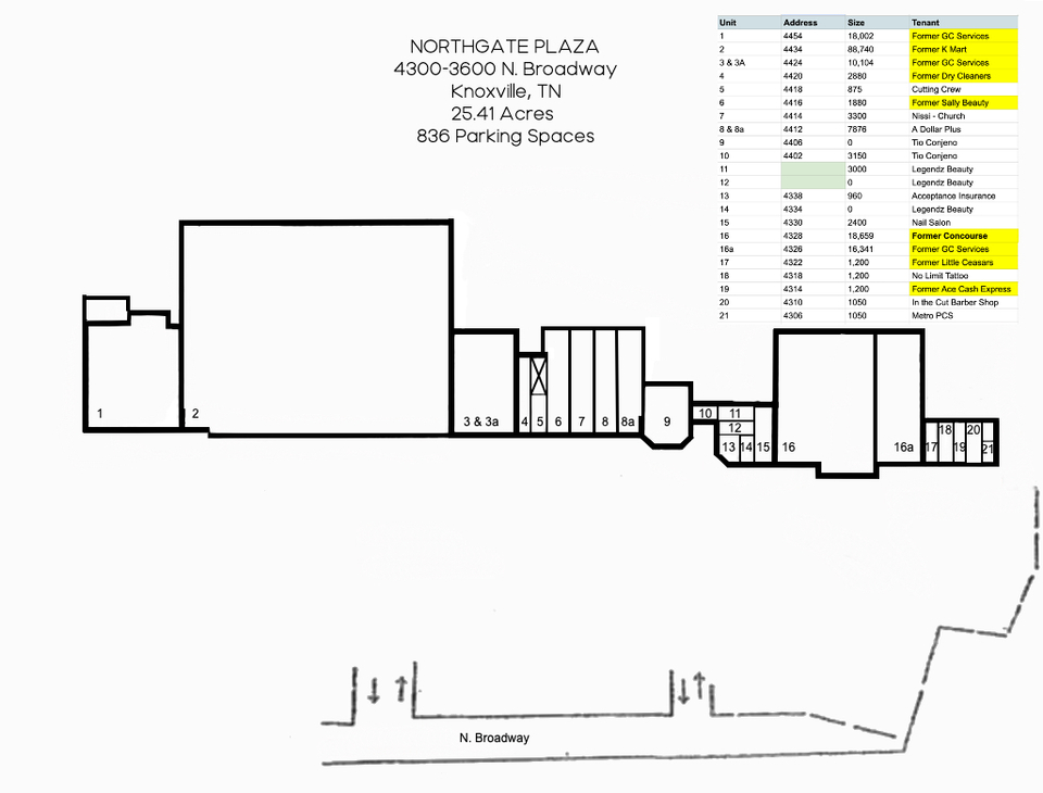 Conveniently located on N. Broadway in North Knoxville with great accessibility to Interstate 640. Service and Retail driven traffic. Located within minutes of downtown Knoxville, Fountain City, and Halls. Easy access to the center with abundant parking.