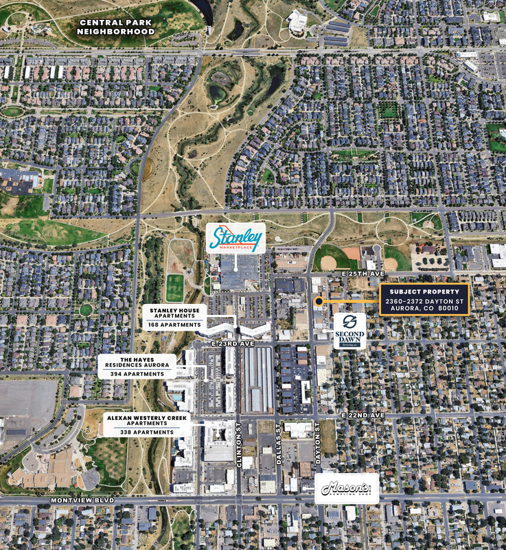 Discover the potential of the surrounding area of 2360-72 Dayton Street in Aurora, CO. Conveniently located near the Central Park neighborhood and major transportation routes, the area offers prime opportunities for investors to occupy or redevelop this site. The nearby Stanley Marketplace provides a vibrant mix of dining, entertainment, and retail options. With easy access to Interstate 225 and the Denver International Airport, the location presents an ideal setting for Retail, Office or Multi-Family uses to thrive. Don't miss out on the strategic advantages that this area has to offer for your investment portfolio.