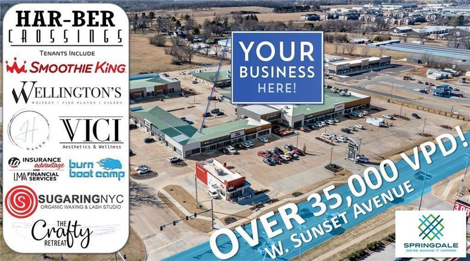 Looking for that perfect spot to start or grow your business? This is your opportunity to capture a fantastic prime commercial space in a thriving and popular strip center in one of the fastest growing market centers in the country, Springdale, Arkansas! Located in the heart of a rapidly expanding area where Springdale meets Tontitown, this fantastic location is situated on the busiest roads in town, West Sunset Avenue, which is traveled by over 35,000 VPD! This unique and highly versatile location is perfectly positioned to provide access to the growing area population and the Har-Ber Meadows Community and is less than two miles from the new Arkansas Children’s Hospital, Arvest Ballpark, and busy I-49! Har-Ber Crossing Plaza boasts a great mix of tenants, superior visibility, ample parking with multiple points of easy ingress and egress, over 300 feet of major road frontage, and a close proximity to other popular area businesses! Act now as you may never find a location nearly as good as this one!