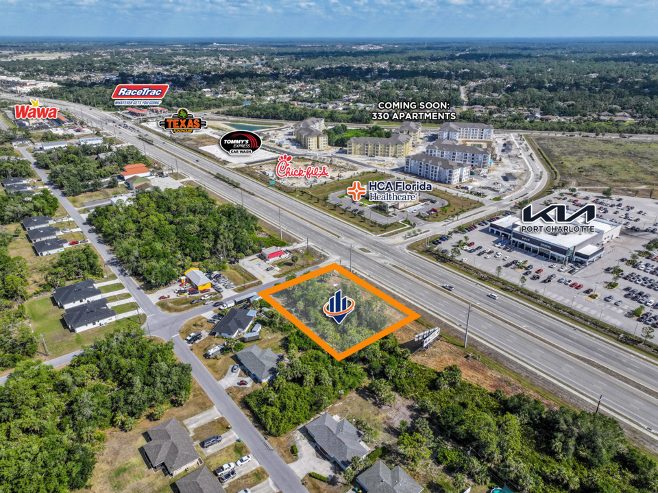 This high visibility corner lot is located off of the bustling US 41 in Port Charlotte with an AADT of 38,000. US 41 acts as a main west coast thoroughfare connecting through Bradenton, Sarasota, Venice, North Port, Port Charlotte, Punta Gorda, Naples, and eastward to Miami. Positioned between the main retail hubs in North Port and Port Charlotte, this site is surrounded by a number of nationwide retailers and shopping opportunities. Development in this area is continuing to expand and grow with the development of a 330 Unit Apartment Complex, Chick Fil A, Texas Road House, and Heartland Dental being developed across the street.