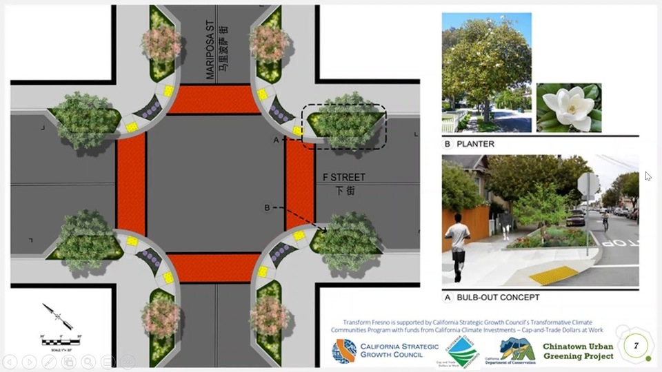 Upcoming Chinatown Urban Greening Project: There are three improvements planned. The first will improve active transportation access to a transit stop in Chinatown located on F and Tulare Streets through the installation of 14 LED streetlights on F Street. Lighting will be installed from Fresno to Ventura Street. The second will increase the urban tree canopy and provide more greenspace in Chinatown. This will be accomplished through planting 26 trees on F Street from Fresno to Mariposa Streets. One parklet will also be installed within these limits. The third will reconstruct China Alley between Kern and Inyo into a permeable green alley and install strand lighting to increase visibility. The City of Fresno will provide the long-term operations and maintenance of the improvements.