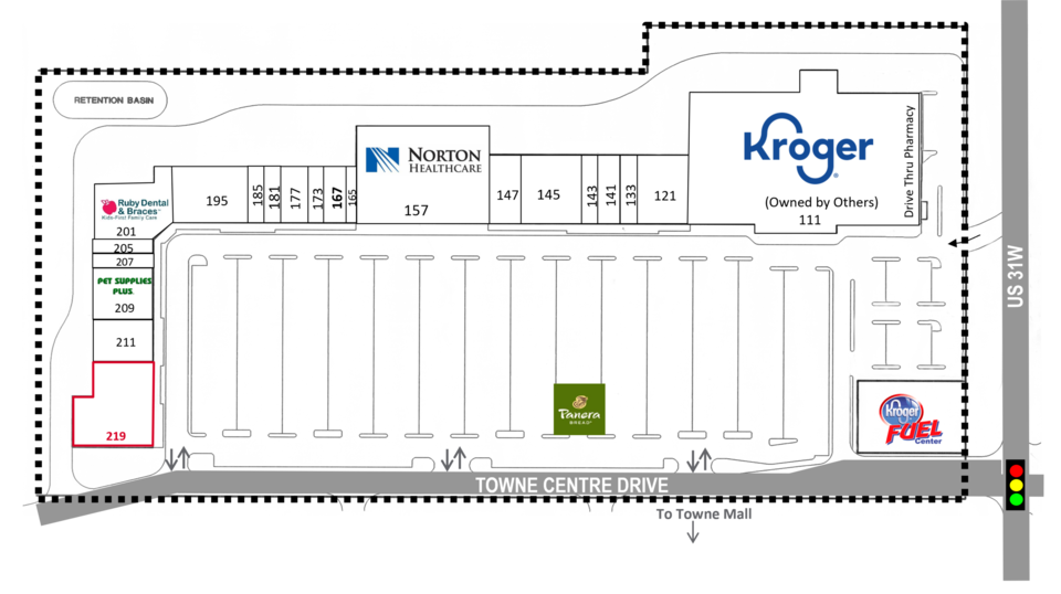 Primary access to Towne Centre is a 2 lane dedicated entrance drive between Towne Centre & Towne Mall (Towne Centre Drive) which connects to US 31W and Veterans Way. The traffic signal at this intersection makes access quick and easy for customers.