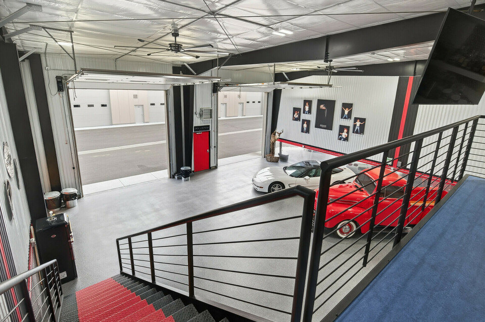 This upgraded 40’ x 50’ garage condo offers a fully finished mezzanine and high-end, motorsports-inspired design. The space includes sleek black/grey epoxy floors, chrome diamond plating, and bold black and red accents for a polished, custom look.