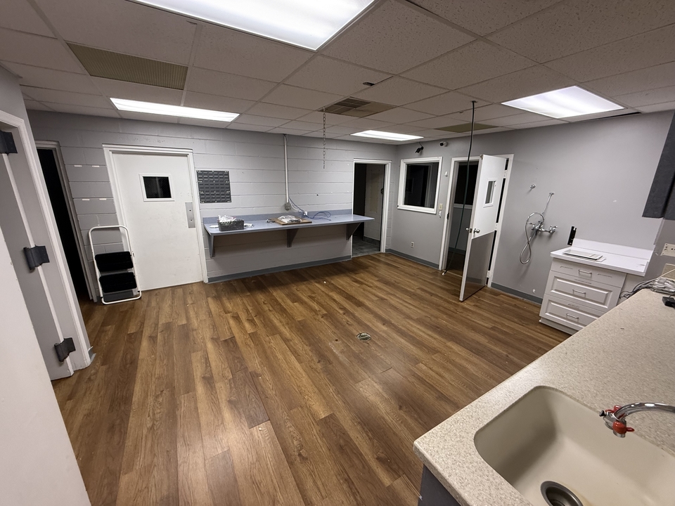 The building includes four exam rooms, a laboratory, quarantine and surgical suites, a treatment area, and a large fenced-in backyard that could serve multiple purposes. It features two separate entrances, which originally allowed for distinct areas for different types of clients and could be adapted for a range of uses.